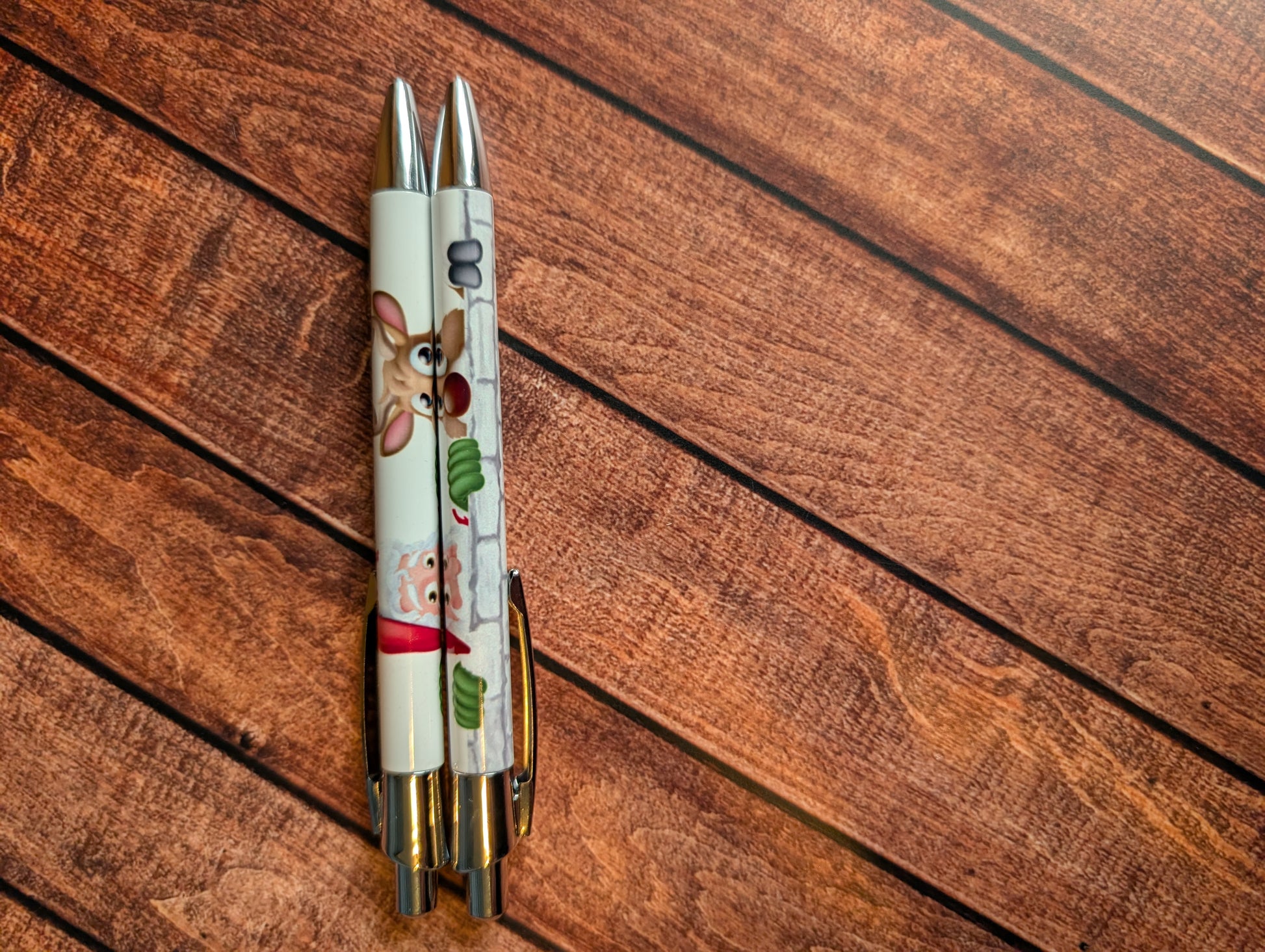 Get ready for the holiday season with this quirky Santa and reindeer pen! With a playful design of Santa and his trusty reindeer peeking over a wall, this pen is perfect for writing down your Christmas wish list or adding a touch of festive cheer to your notes. Comes with black ink for all your writing needs.