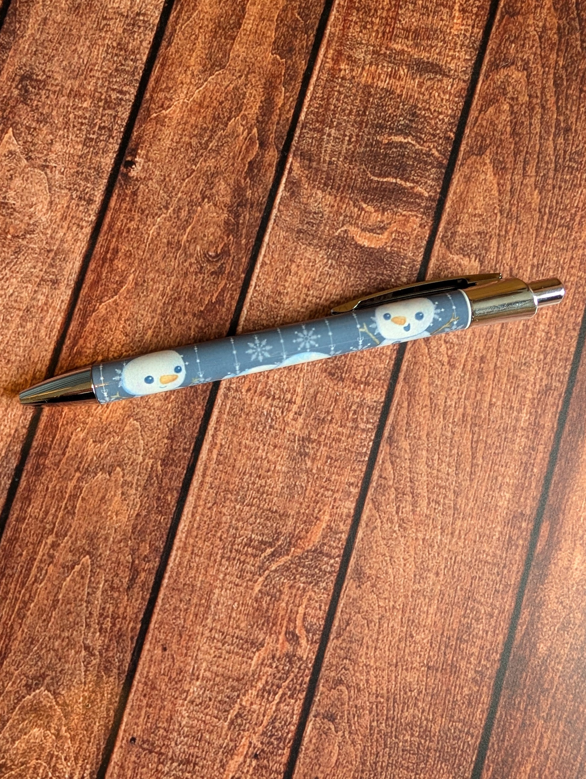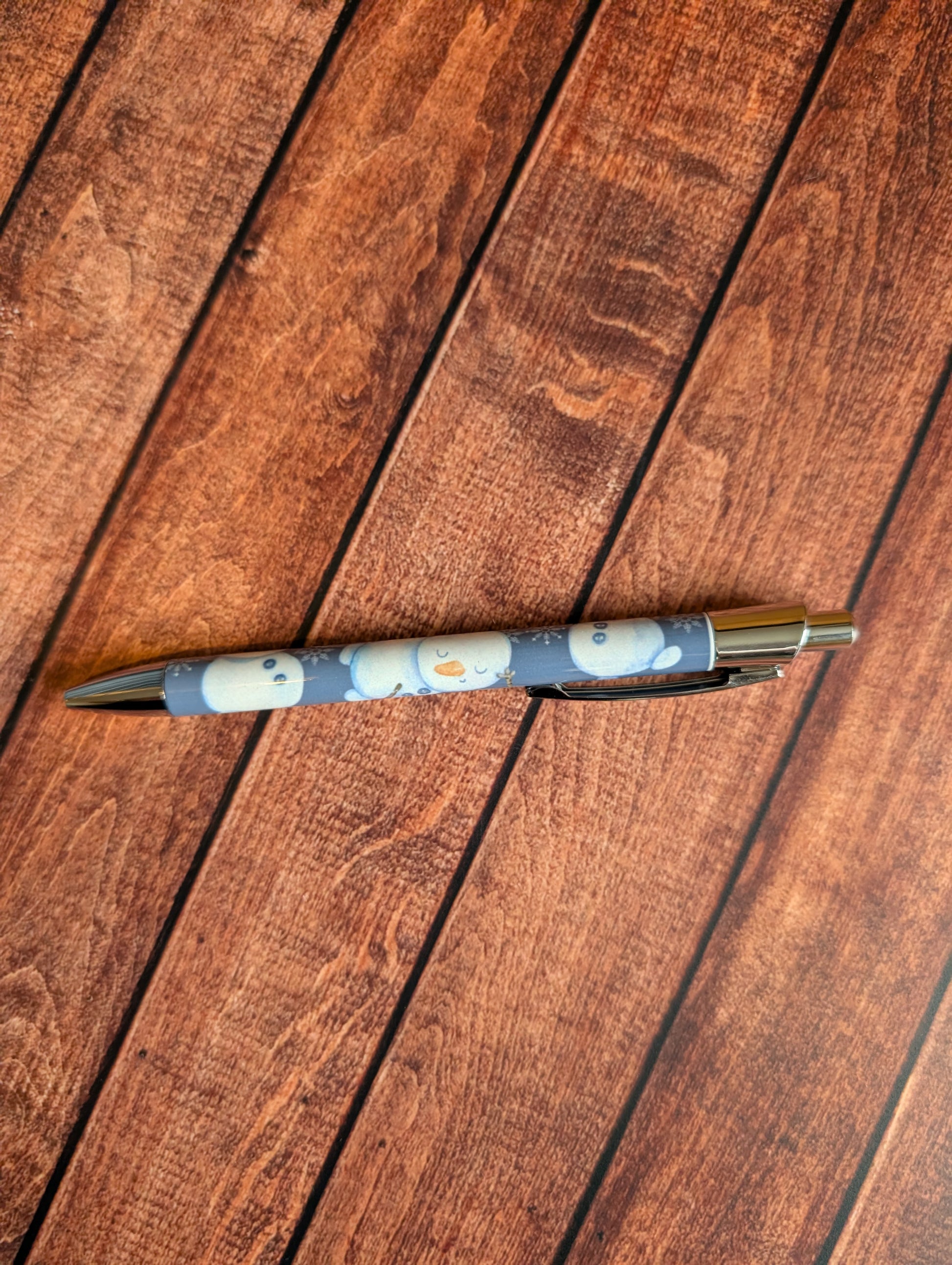 Introducing the Snowman Oopsie Pen. While the blue color may not be as desired and a little white ring around the top, the imperfections have no impact on its flawless functionality. Don't miss out on this exclusive piece, as there are no refunds or exchanges for its minor faults. Upgrade your writing experience with our signature black ink.